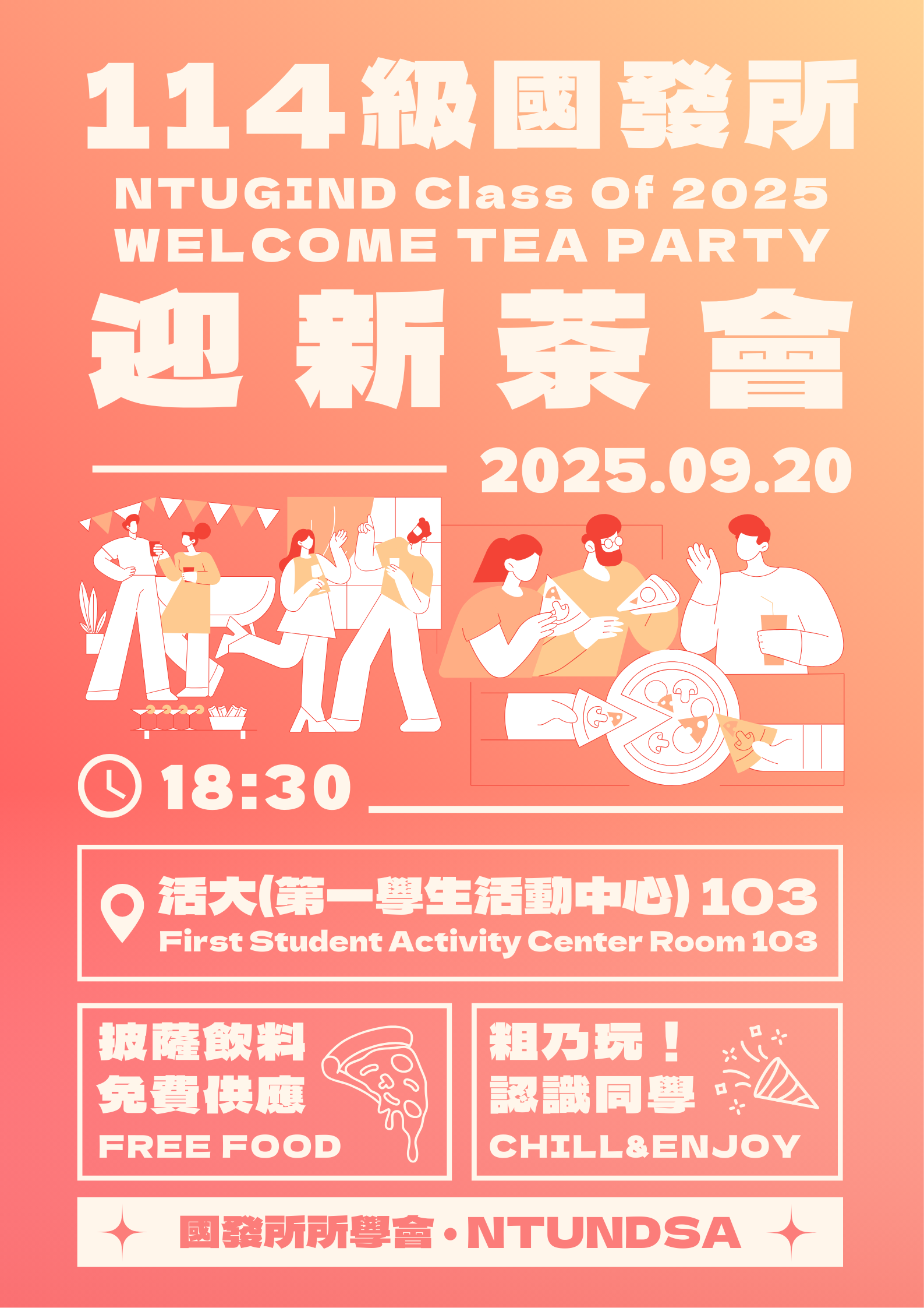 親愛的114級新生們,歡迎加入國立臺灣大學國家發展研究所的大家庭!為了讓大家彼此認識、交流互動,我們特別舉辦迎新茶會,誠摯邀請你一同參加!